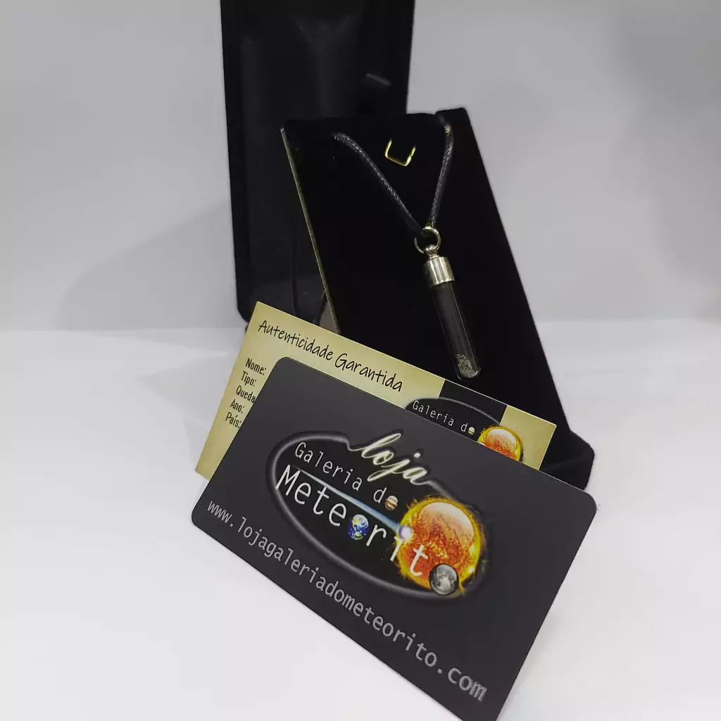 Este colar acompanha cartão de autenticidade que comprova a origem meteorítica das peças no interior, assinado por Richard Cardial. Este espécime é um item de acervo pessoal. O meteorito da foto é exatamente a peça que você receberá em sua casa com este colar.