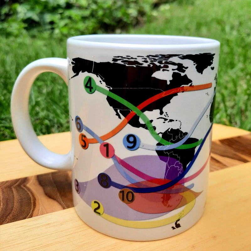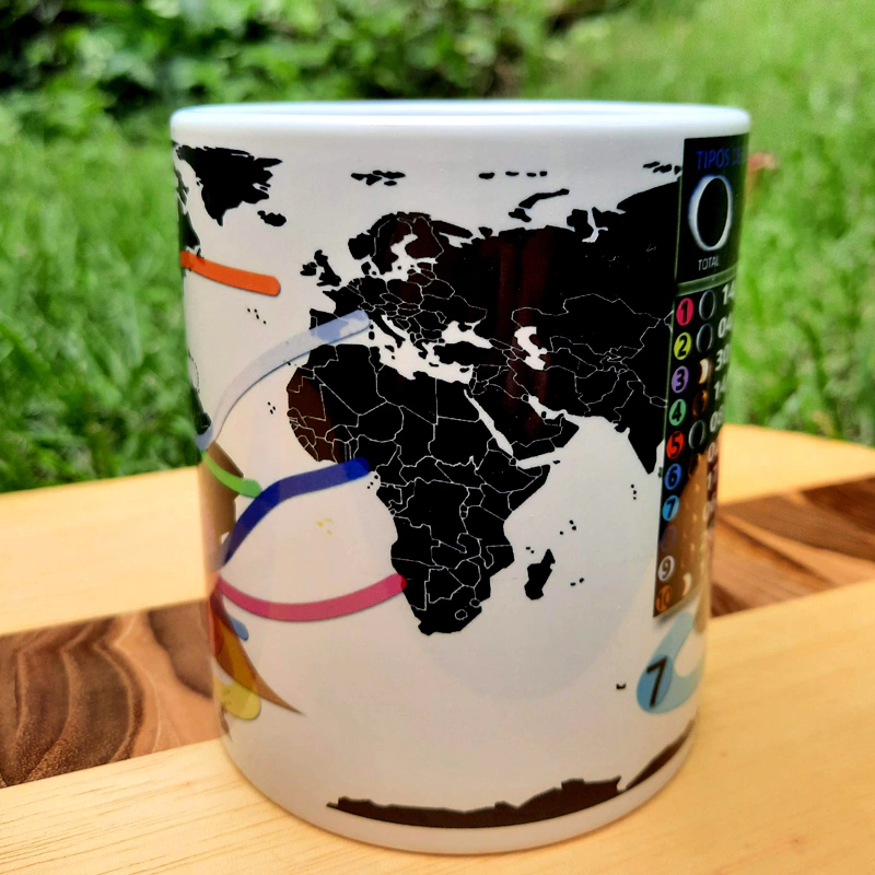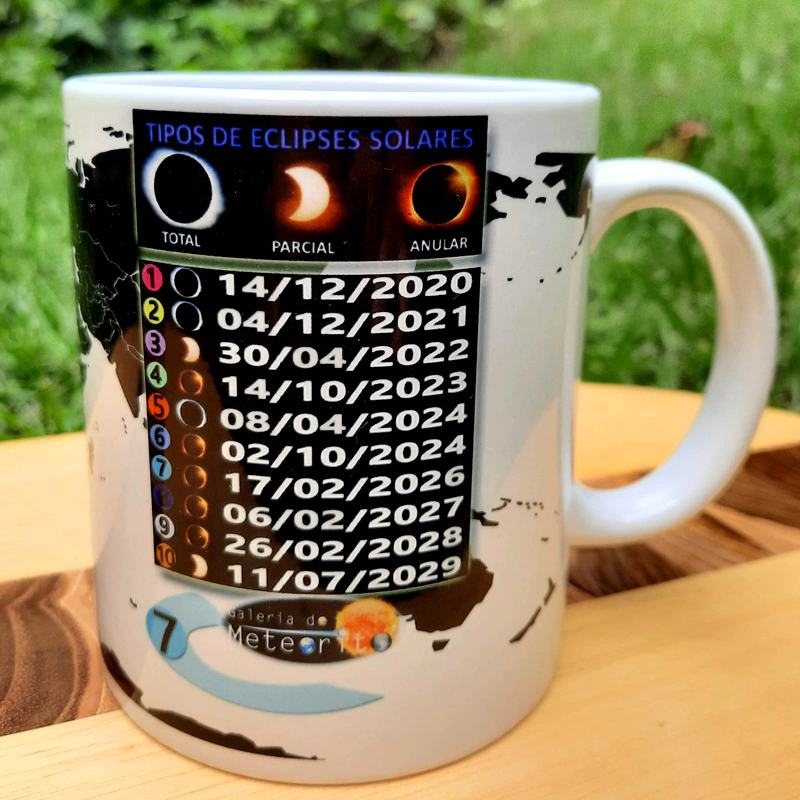 Caneca Eclipses Solares 2020 à 2030, em porcelana. Inclui todos os Eclipses Solares até o ano de 2030, com data e locais de observação no mapa mundi. Agora você não perde nenhum desses incríveis eventos astronômicos!